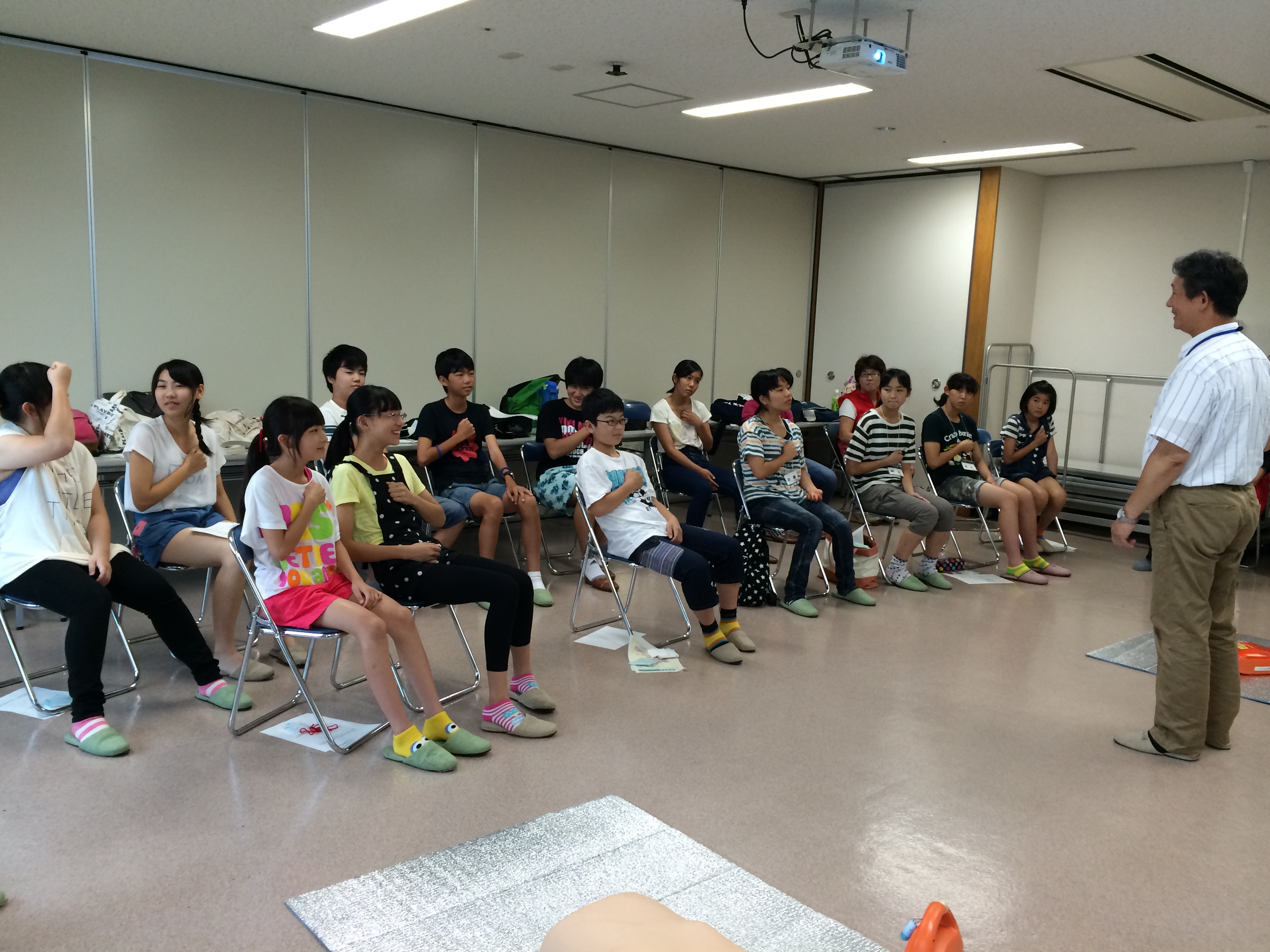 胸骨圧迫の際の手を置く位置や心臓の位置などの説明をさせていただきました。