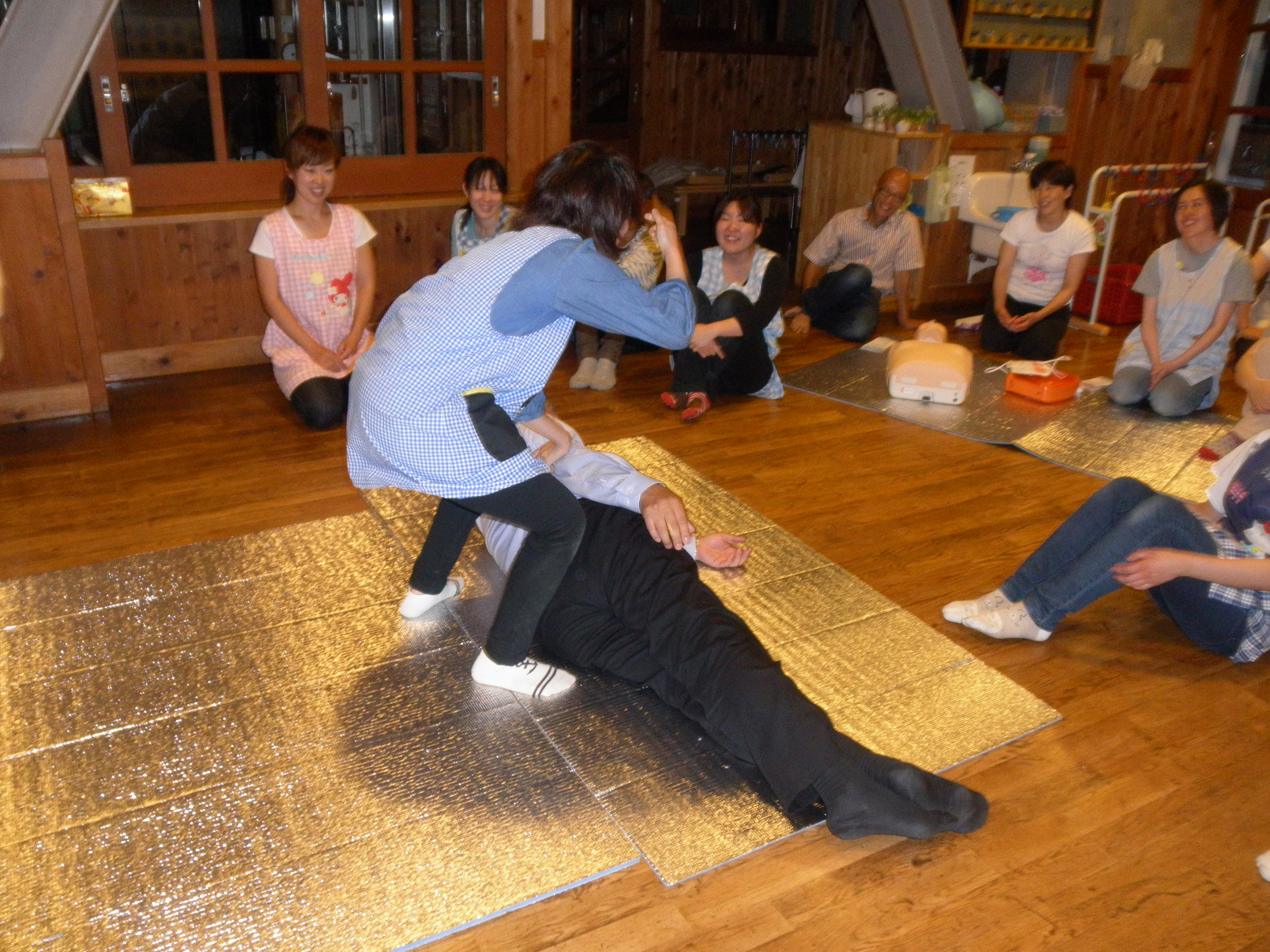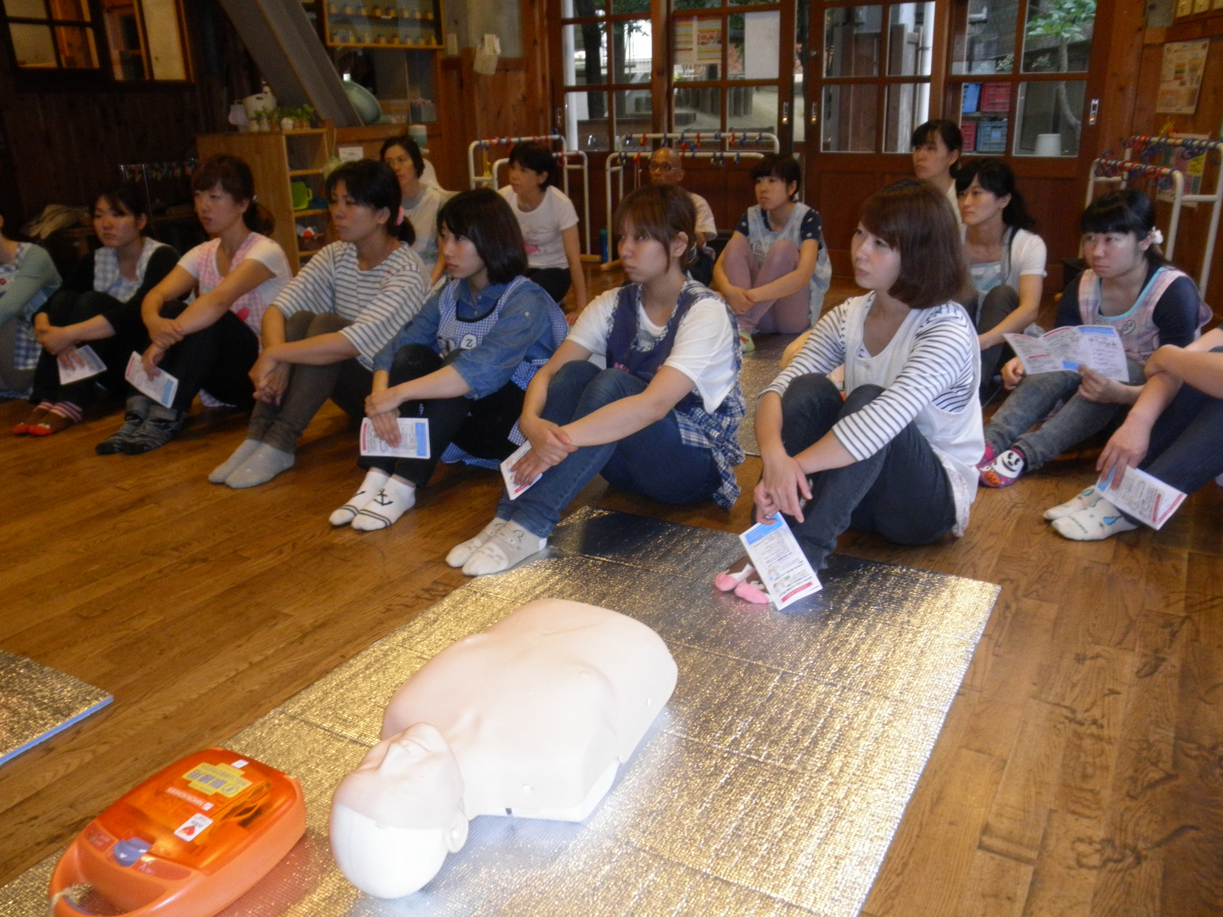 AEDに関するDVDを見て頂き、その後講師がAEDを活用した救命方法の実演を解説をしながら行いました。